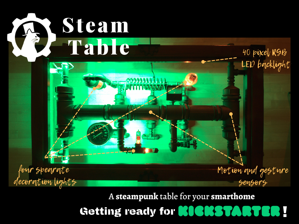 The goal of SteamCat is to create unique, upcycled, and sustainable smart furniture that could become a core element of a smart home that follows the principles of calm technology. It includes custom electronics and software, 3D printed elements combined with natural materials and vintage parts, all integrated with smart home solutions.